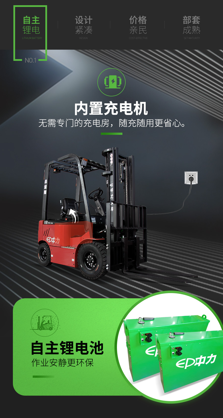 中力自主锂电池,内置充电机,随充随用;