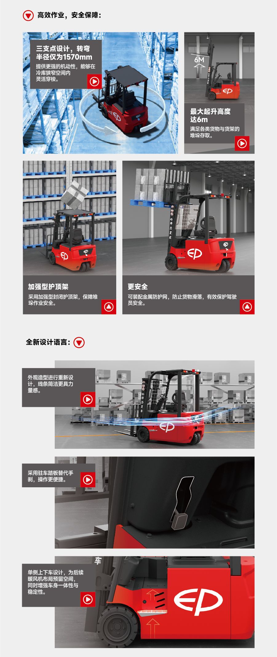 产品卖点:满足-40°C冷库作业需求;高防护等级电气部件;使用耐低温液压油与专用线束;经特殊工艺处理,提高防锈防腐能力;高性能冷库专用橡胶轮胎,增强抓地力;三支点设计,提供更强机动性;