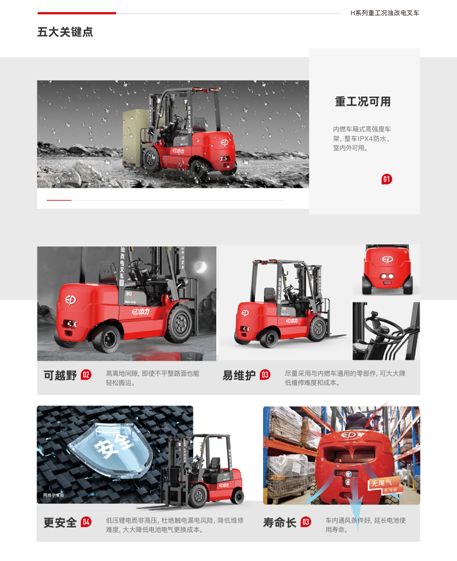 产品卖点全新配重,形象升级;更小车身,操作灵活;绿色锂电,随充随用;结实耐用,可越野,可重工况;