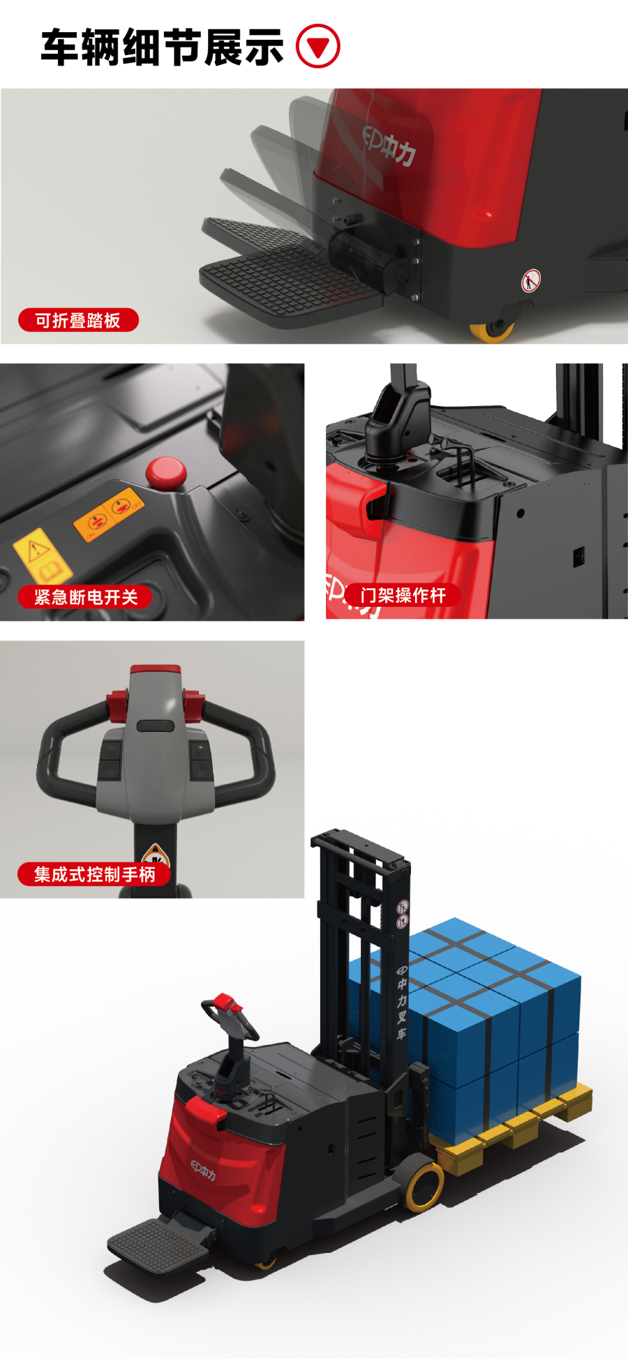 产品卖点小尺寸车身,转弯更灵活;通过性能好,可越野;货叉可前后倾,取放货更方便;无支撑腿设计,适用各种托盘 ;48V85Ah大容量电池;