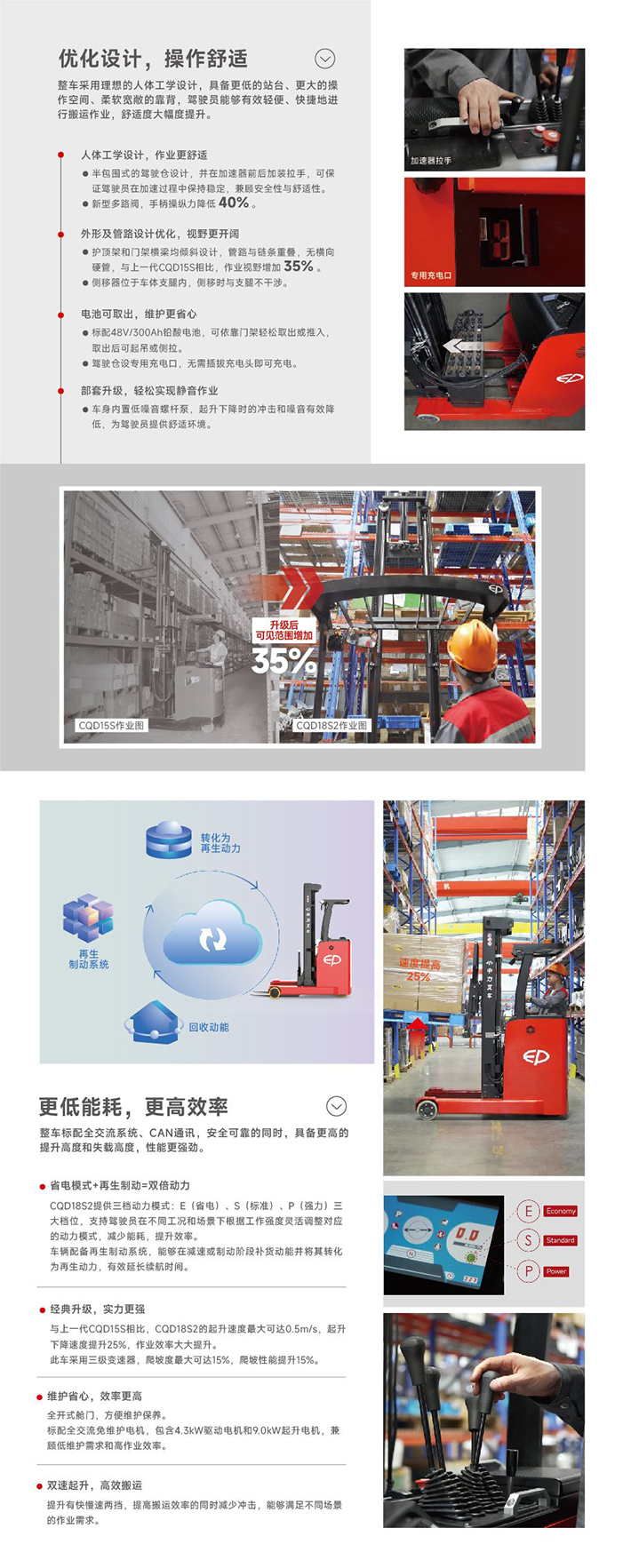 产品卖点理想的人体工学设计,操作舒适;多重智能系统,安全有保障;优化设计,操作舒适;再生动力,更低能耗;双速起升,高效搬运;