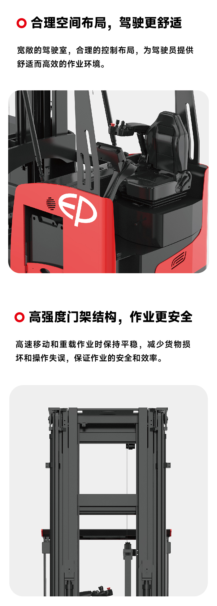 产品卖点小巧精悍,灵活操作;需求定制,适应性强;合理布局,驾驶舒适;高强度门架结构,作业安全;