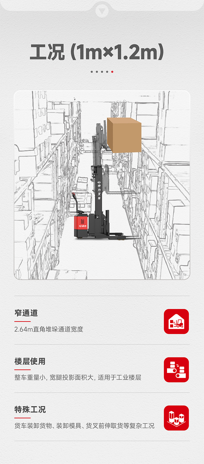 产品卖点高配置、多选配、优价格 多重安全保护;高提升、低失载、低能耗 易操作、高效率;